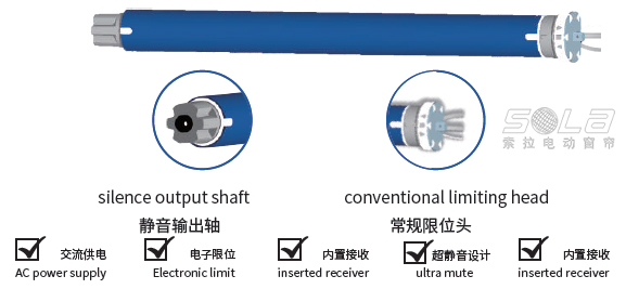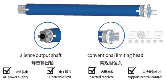 SOLA super silent tubular motor is the most perfect solution for the system control of curtain decoration, sun shading, heat insulation and noise reduction regulation, with a variety of tubular shapes in different specifications The motor is available for all applications. Mainly used in rolling curtain, pleated curtain, honeycomb curtain, electric screen, floor window, curtain wall and other products;Also can be applied in medium, small aluminum, wood shutter products, easy to install, simple wiring, efficient energy saving; SOLA control system is compatible with KNX and hotel guestsControl RCU, RS485, EIB, WIFI, etc.